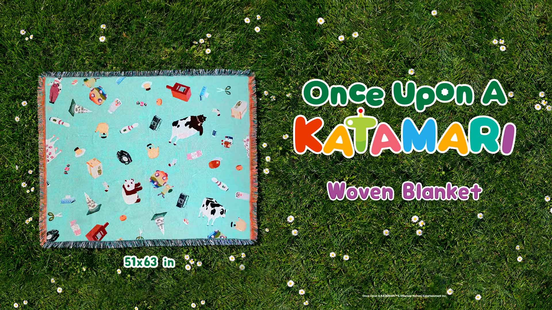 The design features an all-over Katamari-inspired woven pattern, filled with colorful, whimsical in-game objects that bring the world of Katamari to life. Finished with colorful woven tassels, this blanket adds charm and texture wherever it is.