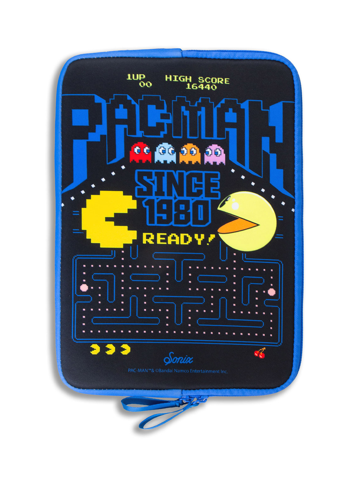 Celebrate 45 years of Pac-Man™ with this stylish 14 inch Pac-Man™ 45th Anniversary Tech Sleeve, designed to protect your laptop or tablet in retro arcade glory. Featuring a black protective sleeve with a vibrant blue zipper border, this sleeve showcases the iconic game’s maze, colorful ghosts, and the classic Pac-Man™ art, evoking nostalgic memories of the legendary game. Crafted from durable, padded material, it offers excellent protection against scratches, dust, and minor bumps, with a secure zipper closure for easy access. Perfect for gamers, fans of the classic video game, and your daily commute, this sleeve combines pixel perfect retro gaming charm with practical functionality.